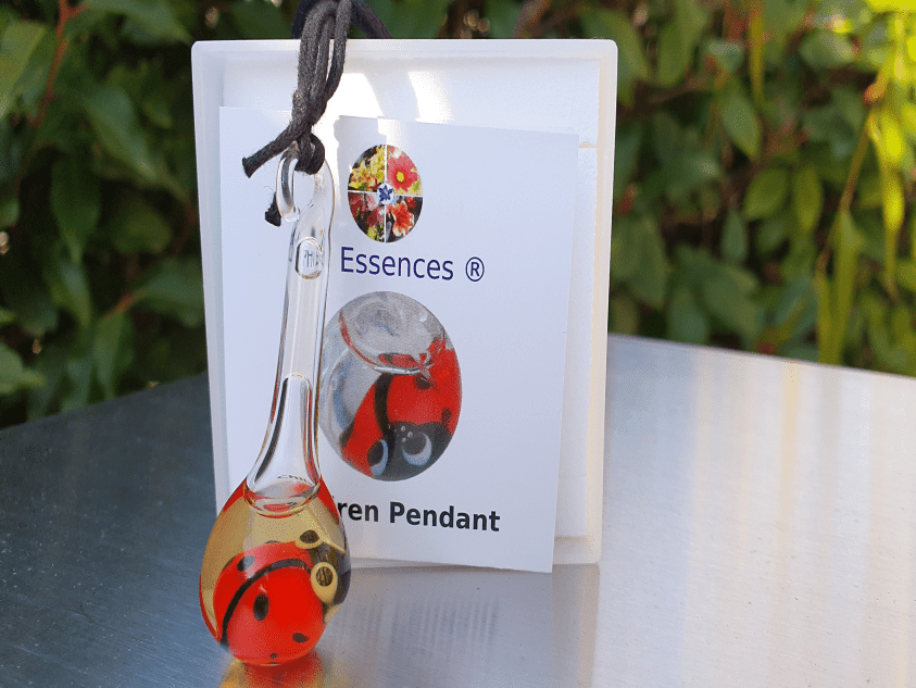 • Un pendentif spécialement conçu pour les enfants, rempli avec l'essence Delph© et une coccinelle en verre, entièrement à la main.