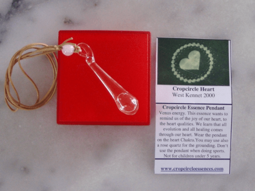 Conception: en verre soufflé transparent est accroché à une lanière de coton réglable. Elixir vibratoire C32 réalisé à West Kennet (GB) en juillet 2000.